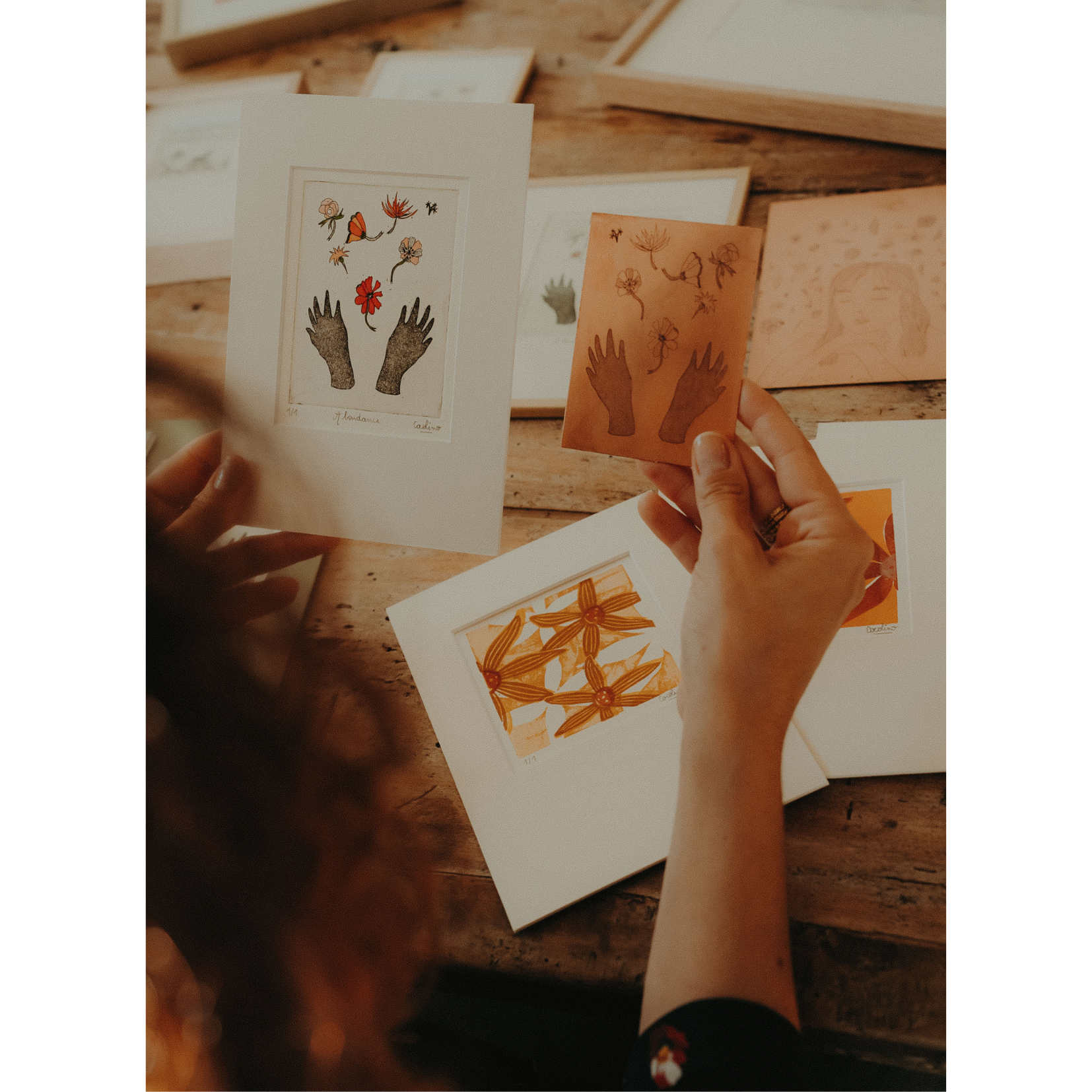 Je dessine, grave puis imprime sur du papier sélectionné en fonction du sujet.